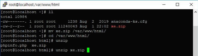 - 명령어 : mv xe.zip /var/www/html/ -> cd /var/www/html/ -> unzip xe.zip
