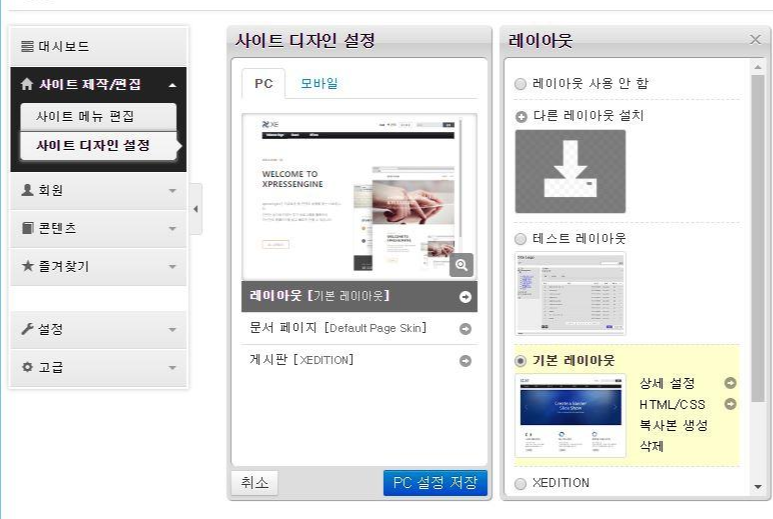 - [사이트 디자인 설정]을 클릭하시면 아래와 같은 화면이 나옵니다.