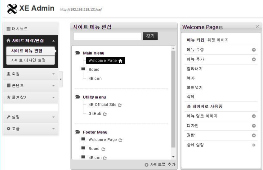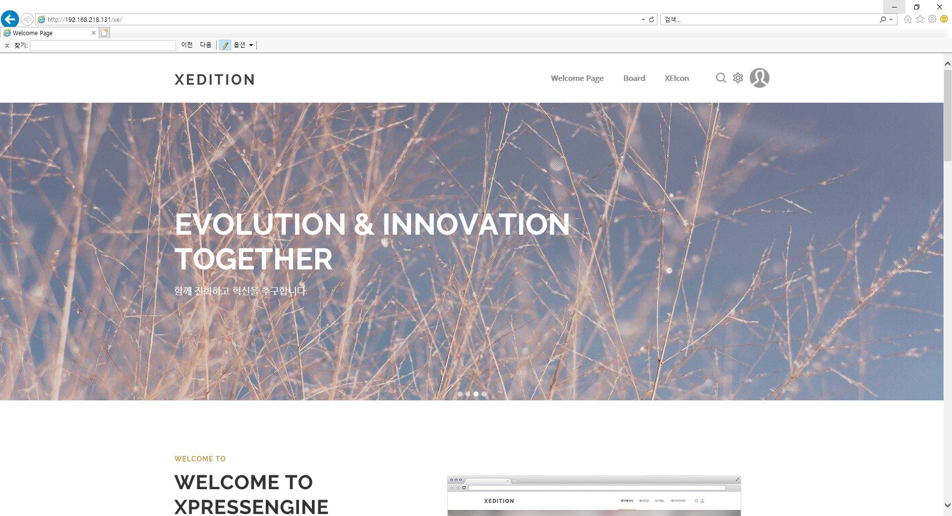 - 설치 후 http://서버ip/xe로 입력하시면 위와 같은 XE화면이 나오십니다.