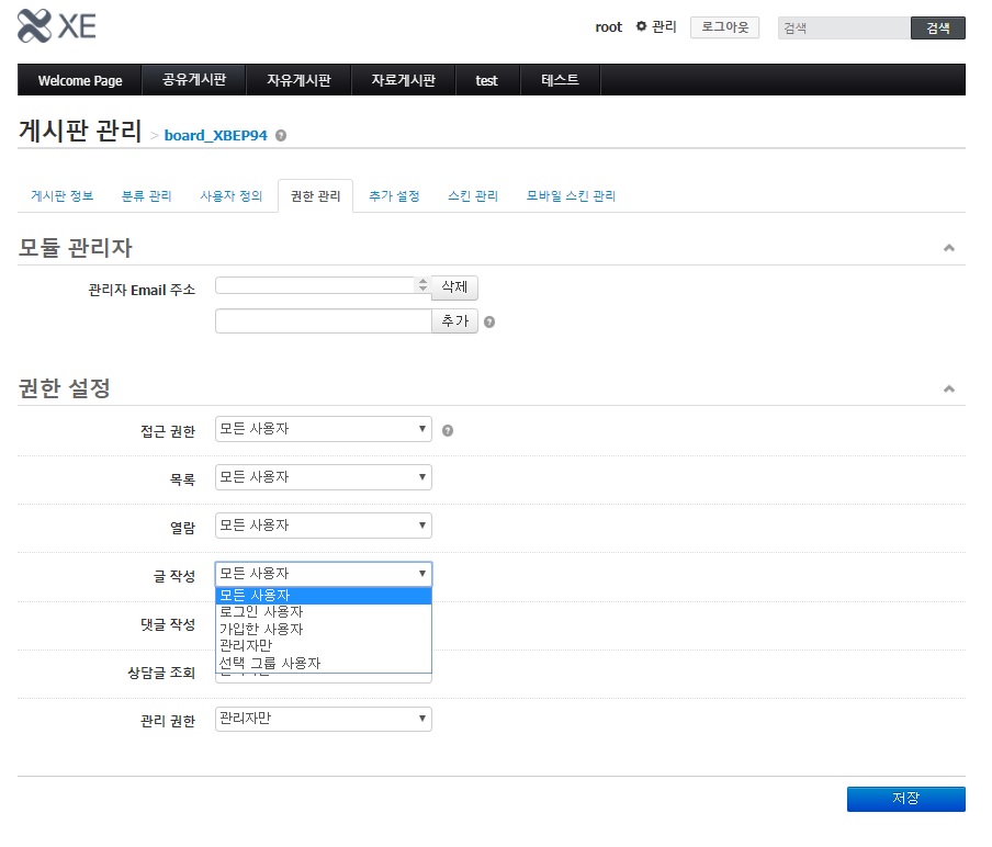 - [권한 관리]탭에서 글 작성을 관리자만 설정 하시면 설정한 게시판에 대해서는 관리자만 글을 작성할 수 있게 됩니다.