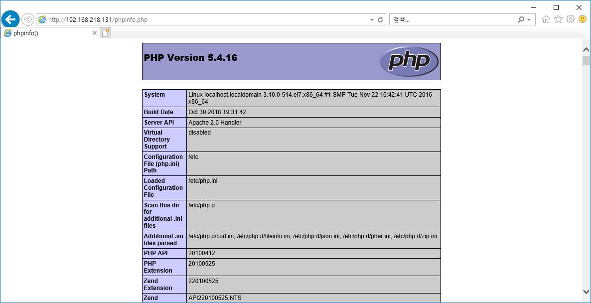 - 실행권한 추가 : chmod +x phpinfo.php 후 http://서버ip/phpinfo.php 입력 후 위의 페이지가 나오면 정상입니다.