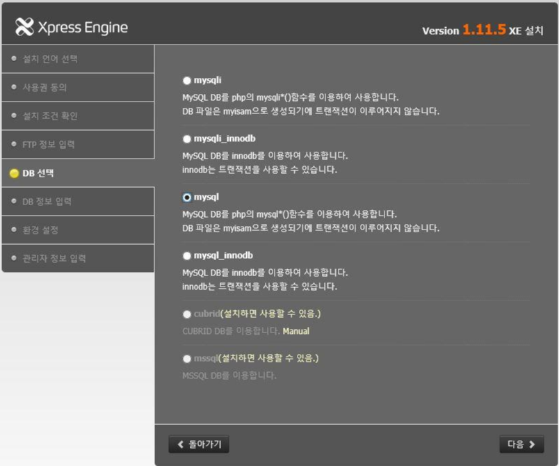 - 설치를 진행하시고 다음 DB선택 단계에서 mysql 체크 후 다음 클릭