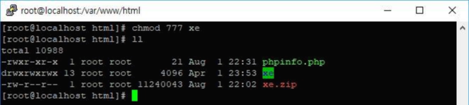 ls 명령어 실행 후 xe폴더 확인 -> chmod 777 xe