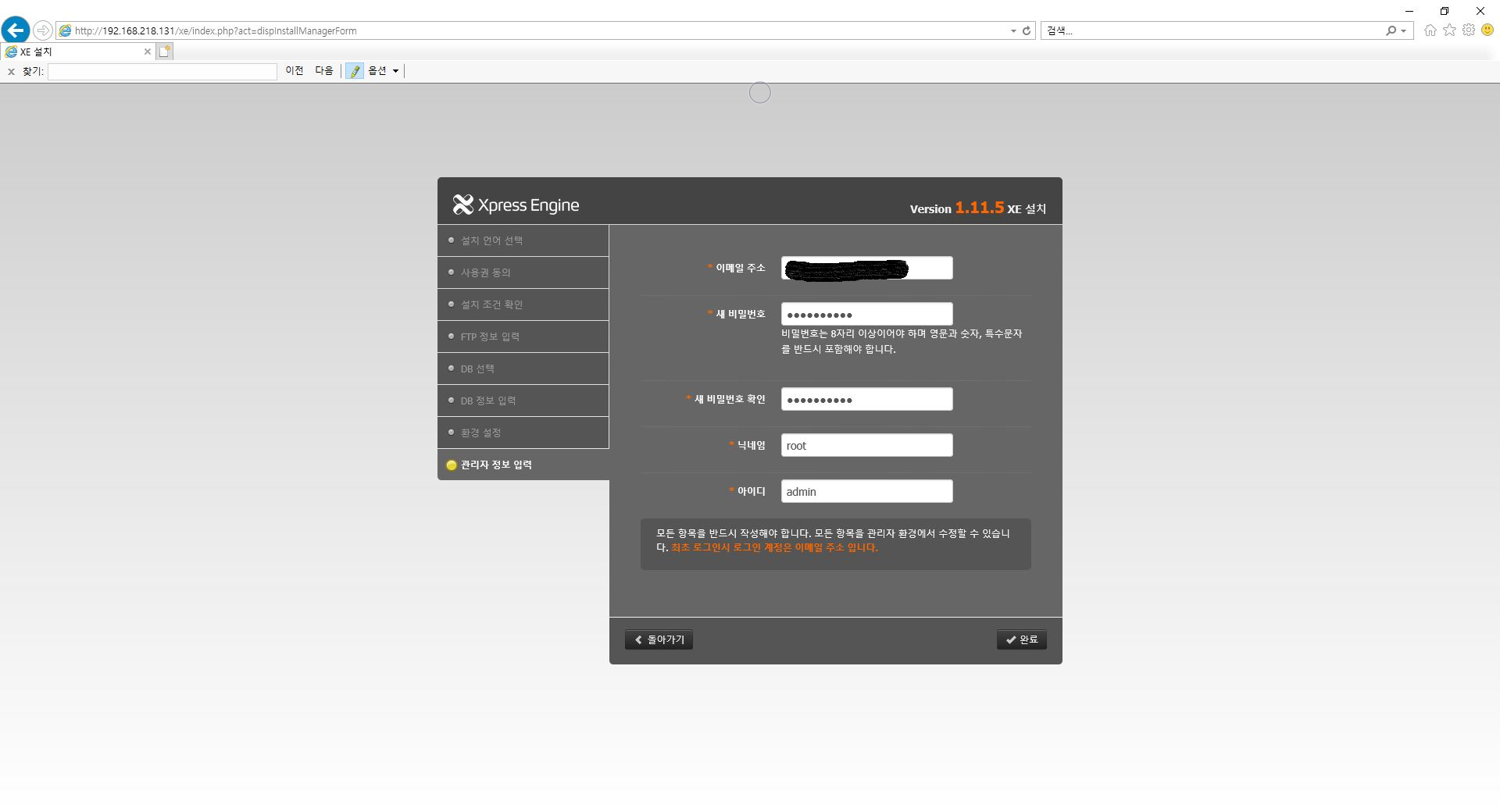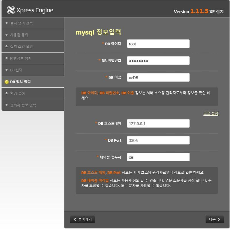 - mysql 정보입력 단계에선 DB계정인 root 와 password 입력 후 DB이름은 앞에 만든 xeDB입력하시면 됩니다.