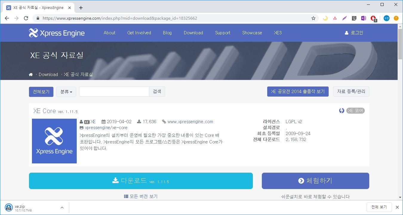 - XE(Xpress Engine)홈페이지 접속 -> 오른쪽 하단에 있는 [Download XpressEngine] 클릭 -> 다운로드 클릭