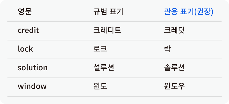 예를 들어 '해법, 해결책'을 의미하는 단어 solution은 외래어 표기 규칙을 따를 경우 '설루션'으로 적어야 합니다. 하지만 실제로 그렇게 적는 사람은 매우 적고, 이미 '솔루션'으로 굳어져 널리 쓰이고 있습니다. 이때 '설루션'으로 적는다면 규칙에 맞게 적었음에도 틀렸다는 오해를 받거나, 심하게는 독자가 문서를 이해하는 데 오히려 혼란을 줄 수도 있습니다. 그렇기 때문에 국립국어원의 외래어 표기법은 제1장 5항에서 '이미 굳어진 외래어는 관용을 존중하되, 그 범위와 용례를 따로 정한다'고 규정하고 있습니다.