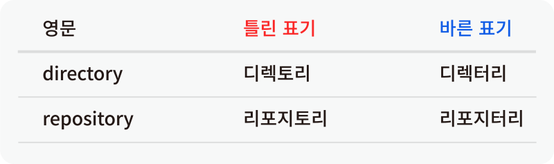 원어의 표기(스펠링)가 아닌, 발음 기호를 확인합니다. 예를 들어 directory는 표기를 기준으로 적을 경우 '디렉토리'가 되지만, 발음([dɪrektəri])을 기준으로 하므로 '디렉터리'라고 적습니다.
