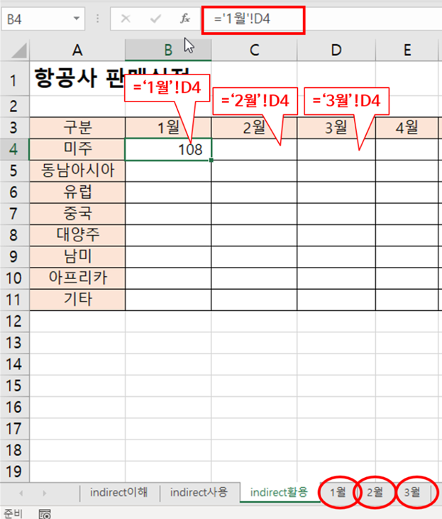 B$3 : '1월' 시트를 참조해야 하므로 [B3]셀의 '1월' 텍스트를 참조함.
