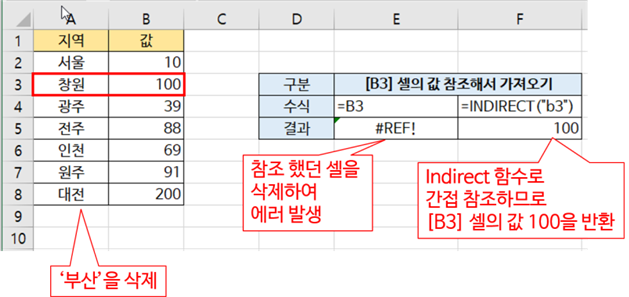 직접 참조한 [E5] 셀은 에러가 나지만, 간접 참조한[F5] 셀은 창원의 값 100을 그대로 반환합니다.