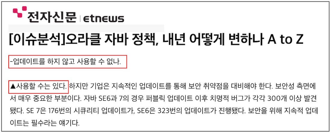 물론 자바 환경을 최신 버전으로 유지하여 버그 수정이 이뤄지고 보안 취약성이 개선된 안전한 시스템을 관리하는 것도 중요하지만, 현재 시스템에 변화를 주는 결정을 하기 어렵고 현재 상태를 유지하는 것이 가장 중요한 경우도 있습니다. 이런 상황에서현재 사용하는 Oracle Java가공개 업데이트 버전이라면, 내년에도 이 Oracle Java를 계속 사용할 수 있습니다.