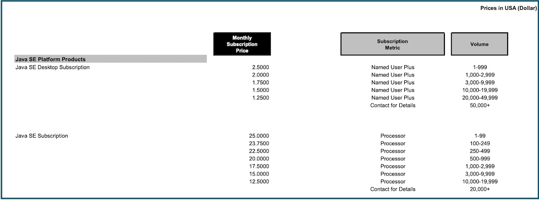 Oracle Java SE Subscription이 발표되었을 때, 가장 많은 논란이 된 것은 자바 개발자 컴퓨터도 Subscription 대상이 되는가에 대한 질문입니다. <그림 2>의 가격 테이블 첫 부분에 “Java SE Desktop Subscription”이 나와 있다 보니 이 문제가 더 크게 주목받은 것 같습니다.