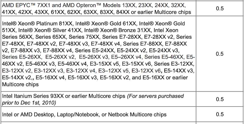 Java Subscription은 월 단위로 Core 수량으로 계산되며, x86을 사용할 경우 50% 할인됩니다. Oracle은 자바 개발 및 테스트 환경에 양도 불가능한 사용 라이센스를 제공하기 때문에, Java Subscription을 산정할 때, 개발자 컴퓨터, 개발 테스트 서버, 빌드 서버는 Java Subscription에 포함되지 필요 없습니다.
