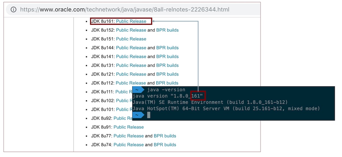 Java 버전과 업데이트 번호로 현재 사용하는 Oracle Java가 공개 버전인지 비공개 버전인지 확인할 수 있습니다.