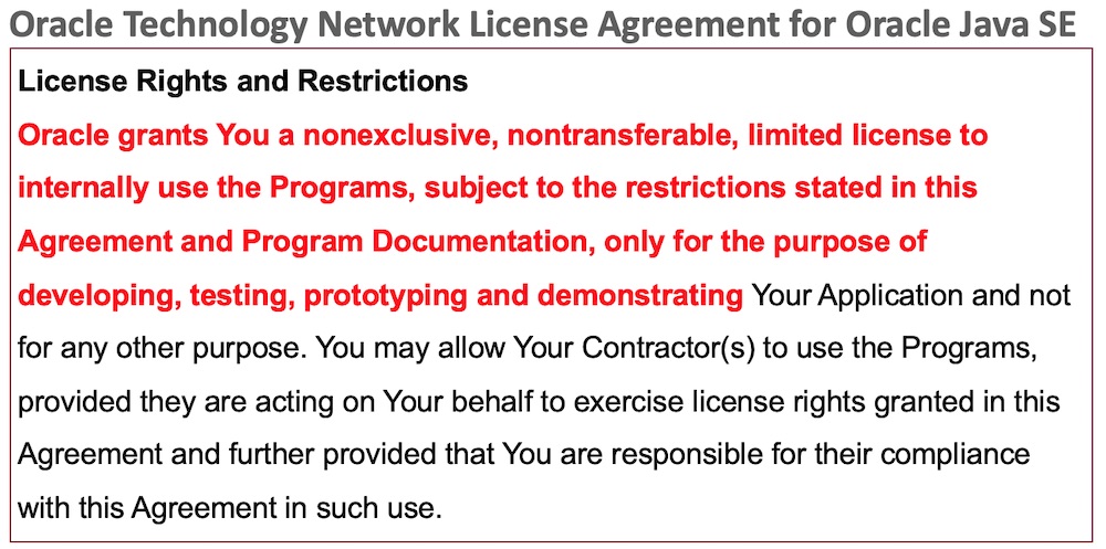 개발자 컴퓨터는Oracle Java SE Subscription의 적용 대상이 아니라는 근거는 OTN 자바 라이센스 전문에서 찾을 수 있습니다. 다음은 OTN 자바 라이센스 전문에 있는 “License Rights and Restrictions” 절의 내용입니다.