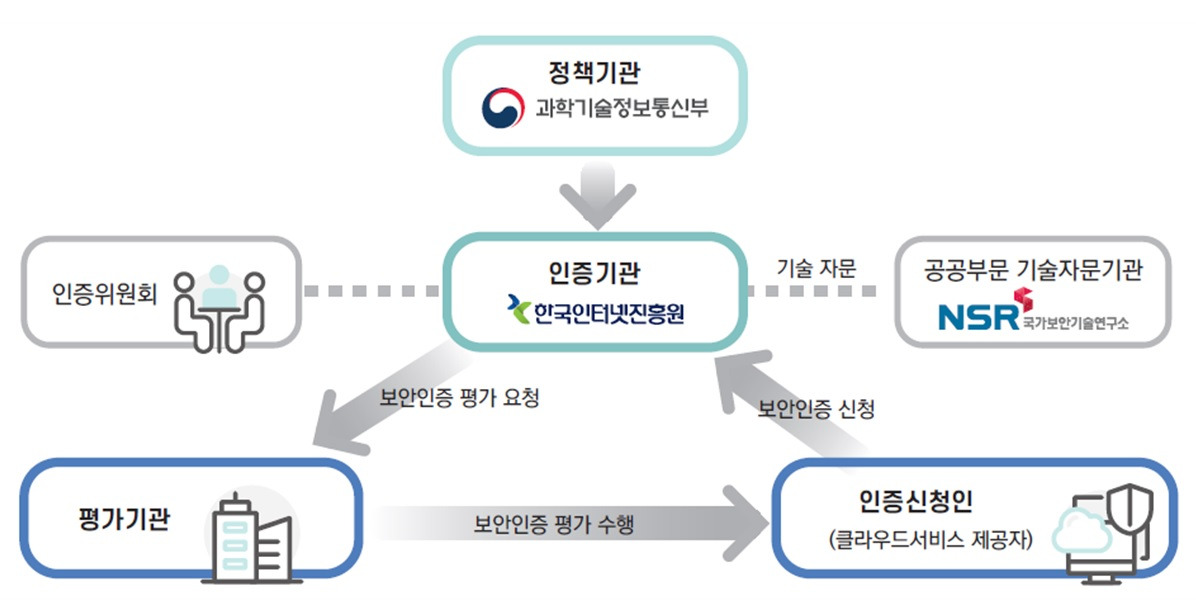 - 인증기관 (한국인터넷진흥원): 인증위원회 개최, 공공부문 기술자문기관 (국가보안기술연구소)에서 기술자문, 평가기관에게 보안인증 평가요청, 인증신청인 (클라우드서비스 제공자) 보안인증 신청