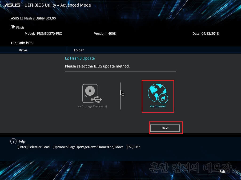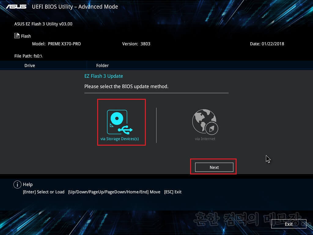 아까와는 달리 다운로드받은 파일을 통해 바이오스를 업데이트 할 것이므로, "via Storage Devices → Next → <다운로드받은 파일명> 클릭 → Yes → Yes" 를 순서대로 눌러 주자. 중간에 파일을 선택하는 부분에서는, 아까 본인이 확인한 파일명을 선택하면 된다. 필자의 경우 PRIME-X370-PRO-ASUS-4008.CAP 이며, 다운받은 버전에 따라 이름이 다르니 잘 보고 선택하시기 바란다.