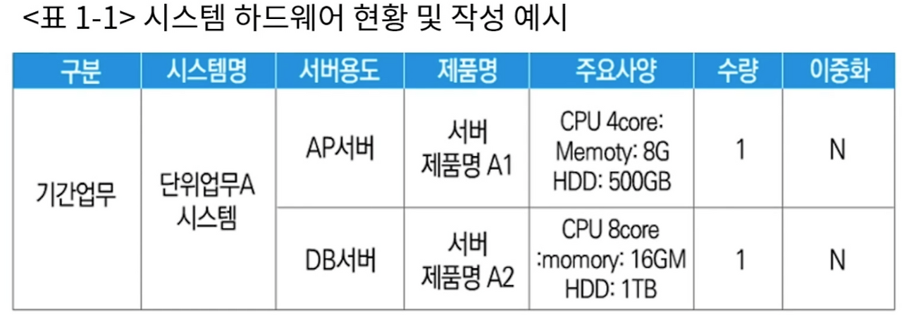 - 적용 기술요소, 소프트웨어, 하드웨어, 네트워크 구성요소 파악
