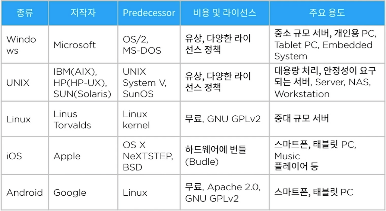 - 주요 운영체제는 마이크로소프트 윈도우즈 ( Microsoft Windows ), 유닉해( UNIX ), 리눅스 ( Linux ), 아이오에스( iOS ), 안드로이드 ( Android ) 등