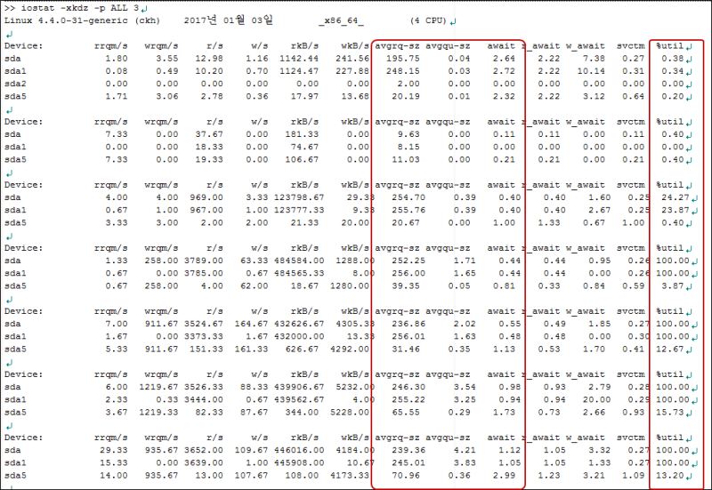 . %util : 해당 Device에 발생된 I/O request의 bandwidth utilization. serial request의 경우 100%에 근접할 경우 Device saturation이 발생함. parallel일 경우 (RAID, SSD등)는 해당 수치가 성능 한계를 반영하지는 않음