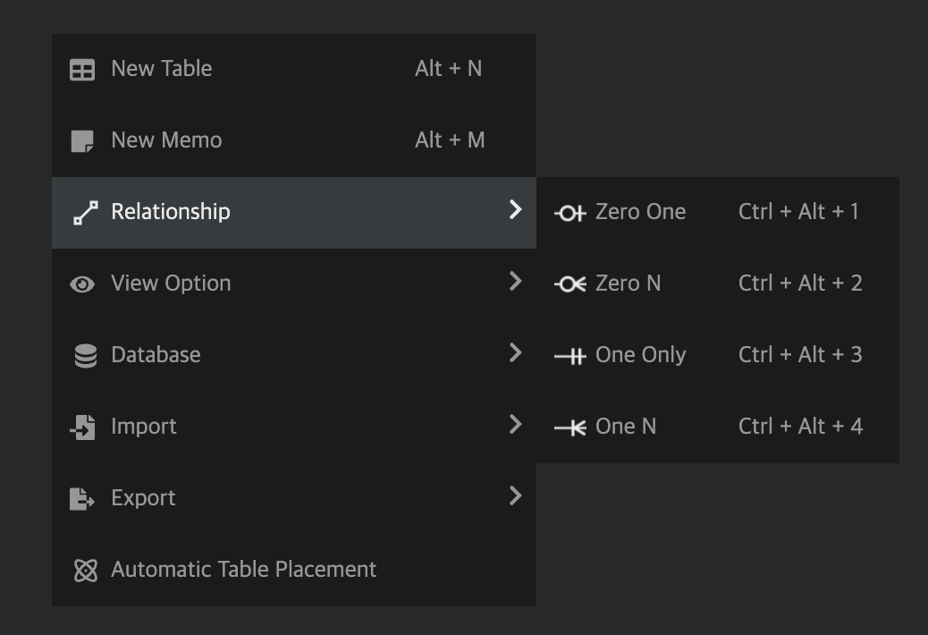 만약 테이블간에 관계를 설정하고 싶다면 "Relationsship" 을 클릭하고 관계를 선택해주면 된다.