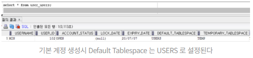 기본 계정 생성시 Default Tablespace 는 USERS 로 설정된다
