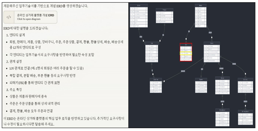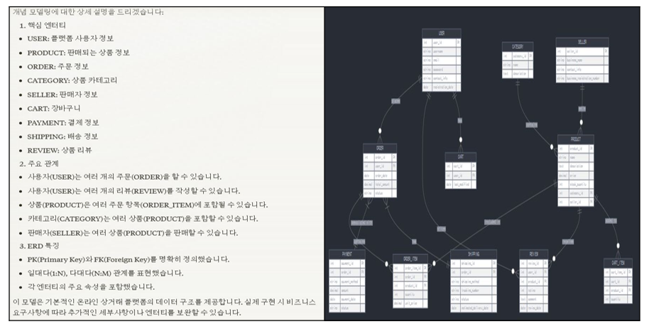 [그림 7] [단계 3] 프롬프트에 업무기술서 제시 후 반환된 Claude 답변 | [그림 8] [단계 3] 과정으로 Claude가 생성한 ‘온라인 상거래 플랫폼’ 개념 ERD