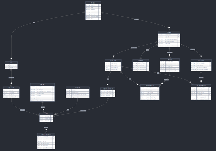 프롬프트 : 핵심 엔터티로 ‘회원’, ‘상품’, ‘주문’, ‘결제’, ‘배송’, ‘환불’이 포함 되어야 해.