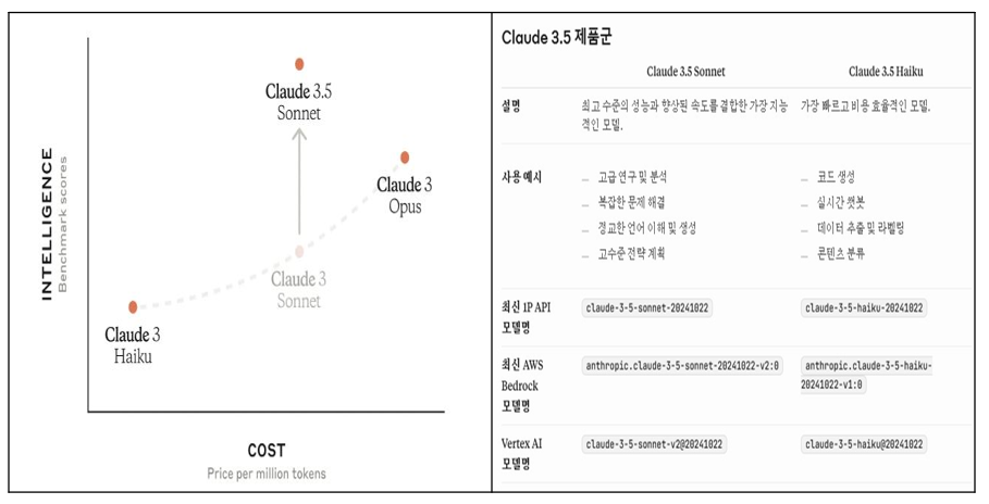 [그림 1] Claude 3.5 Sonnet의 성능 비교 그래프 | [그림 2] Claude 3.5 모델 비교