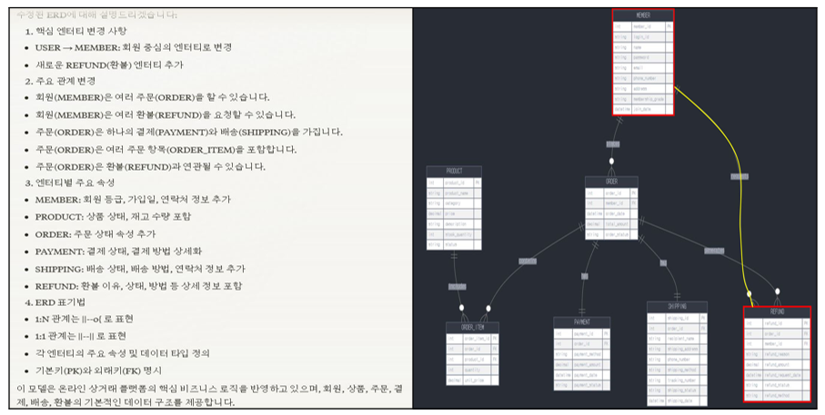 2.3.2 [단계 2] <단계 1>에 핵심 엔터티를 추가 제시 할 경우2.1의 핵심 엔터티 ‘회원, 상품, 주문, 결제, 배송, 환불’를 사용하도록 [단계 1] 프롬프트에 핵심 엔터티 사용을 직접 제시 할 경우 엔터티가 ‘회원’, ‘상품’, ‘주문’, ‘결제’, ‘배송’, ‘환불’ 로 한정되며, 엔터티 관계의 오류가 발생합니다.