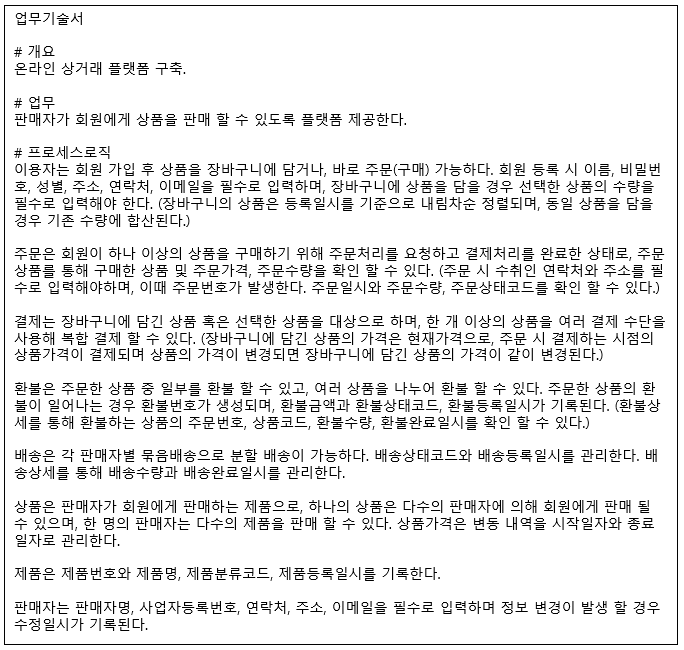 2.3.3 [단계 3] 업무기술서 제시를 통한 개념 ERD 생성‘온라인 상거래 플랫폼’ 모델링을 위해 기술한 업무기술서를 클로드 프롬프트에 입력하여 ERD를 생성했습니다.