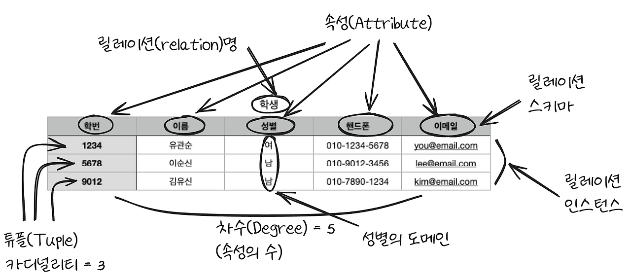 위 테이블은 학생이라는 테이블을 만들었다고 했을 때의 모습입니다. 학생이 바로 릴레이션(Relation)명이 됩니다. 속성(Attribute)은 학번, 이름, 성별, 핸드폰, 이메일등 릴레이션의 열에 있는 것 입니다. 속성의 개수가 총 5개인데 이것을 Degree 우리말로는 차수라고 합니다. 여기서는 5가지의 속성을 가지고 있기 때문에 Degree 혹은 차수가 5라고 할 수 있습니다. 이렇게 모든 속성의 구조 및 이름을 통틀어 릴레이션 스키마라고 합니다.