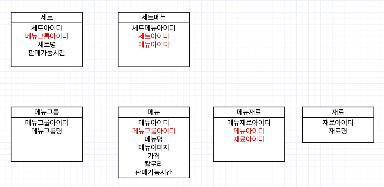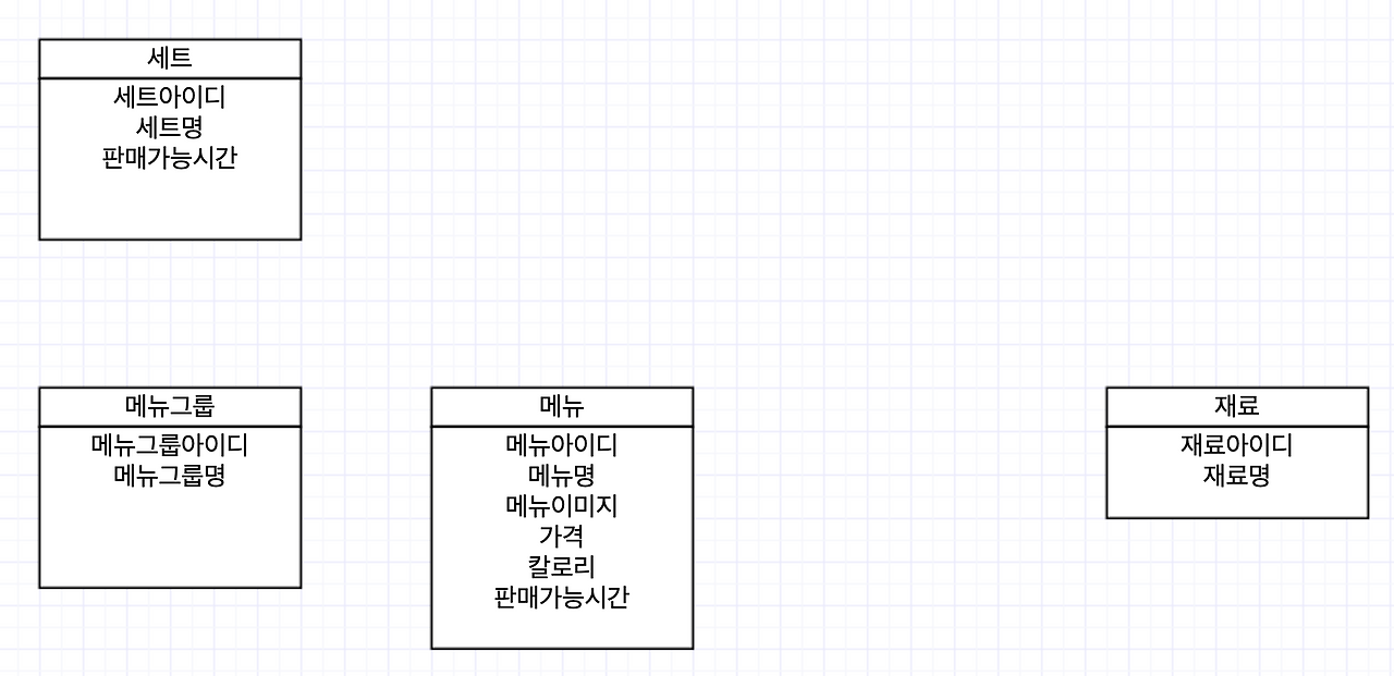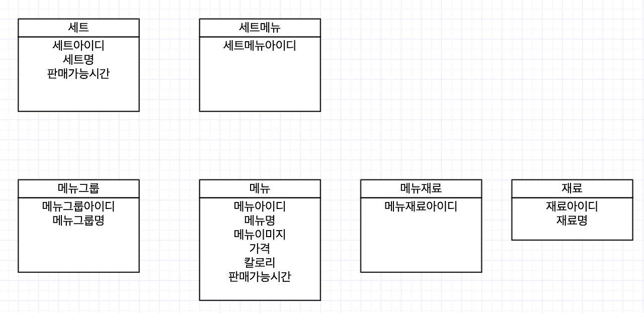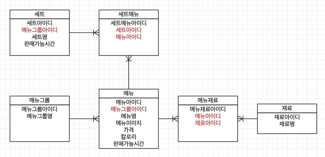 위 요구사항에서 세트메뉴, 메뉴재료라는 다대다 테이블이 생겨났다.
