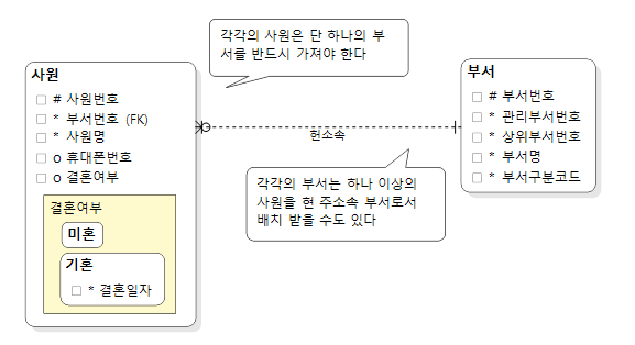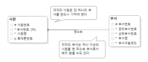 관계의 표현에는 바커 표기법(Baker Notatio)과 I/E 표기법((Information Engineering Notation)이 있다. 관계란 양방향관점에서 봐야 한다. 사원과 부서 엔터티 간의 관계를 살펴보자. 각 관계를 설명하자면 사원을 주어로 부서를 보는 관계에서 의미는 '각각의 사원은 단 하나의 부서를 반드시 가져야 한다'라고 정의할 수 있다. 또한 부서를 주어로 사원을 보는 관계의 정의는 '각각의 부서는 하나 이상의 사원을 현 주소속 부서로서 배치 받을 수도 있다'라는 의미를 표현한 것이 바로 관계선이다.