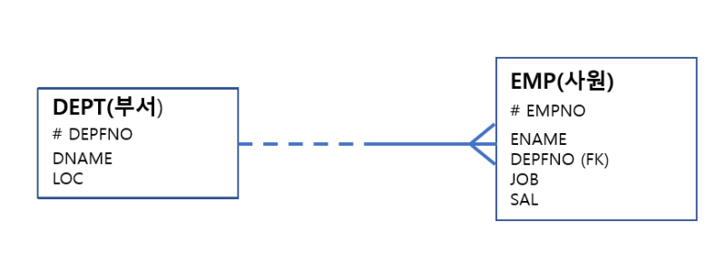 - 하나의 부서는 여러명의 사원을 보유할 수 있다.