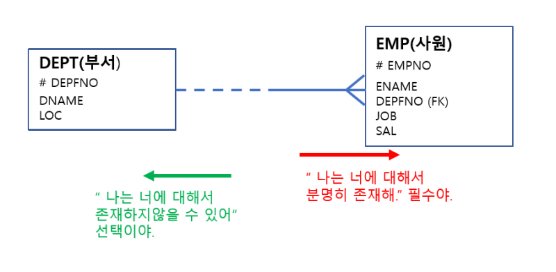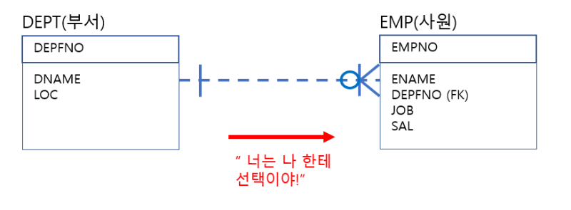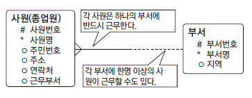 사원은 부서한테 있어서 선택이다. 하지만 사원에게 부서는 필수이다. 때문에 사원한테는 ㅇ가 있고 부서한테는 없다.