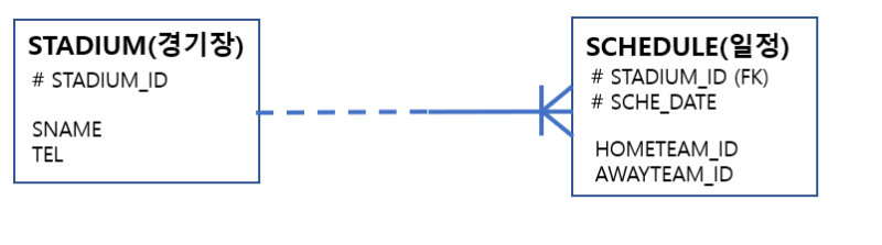 반대로 점선일때에는 상대 엔터티에대해서 해당 엔터티에 조건을 만족하는 엔터티가 존재할 수도 있고 없을 수도 있다.
