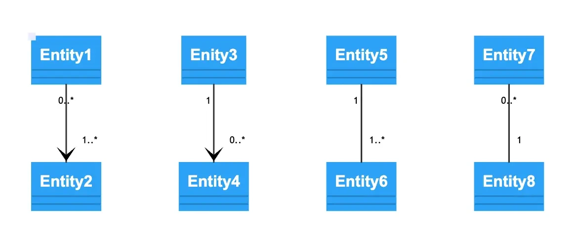 - 관계선으로 표현하며, 선 끝에 관계의 종류(1:1, 1:N, N:M)를 표시.