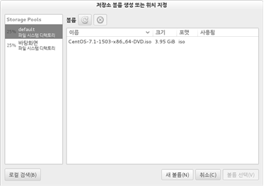 관리중인 저장소가 나타났습니다. 저장소(Storage Pool)를 추가/제거/관리하기 위해서는 가상머신 관리자의 메인 화면에서 "편집“ > ”Connection Details" > "저장소“를 선택하여 관리할 수 있습니다. 생성할 수 있는 저장소의 종류는 다음과 같습니다.