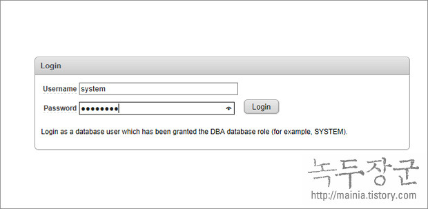 ▼ 접속 후 4개의 메뉴 중 하단에 있는 Application Express 를 클릭합니다. 그럼 계정 로그인 창으로 이동하게 될 겁니다. 로그인 창에서 Oracle XE 설치할 때 입력했던 비밀번호를 입력하시면 됩니다. 아이디는 sys 나 system 둘 중에 하나 입니다.