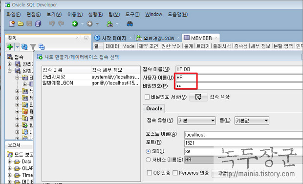 ▼ 계정의 비밀번호까지 만들었다면 접속해 봐야겠죠. Oracle SQL Developer 을 실행합니다. 그리고 설정한 사용자 이름과 비밀번호를 넣고 접속합니다.