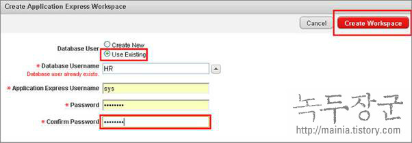 ▼ Database User 는 존재하고 있는 것이 므로 Use Existing 을 선택합니다. 그리고 Application Express Username 에 시스템 계정과 비밀번호를 입력합니다. 입력 후 오른쪽 상단에 있는 Create Workspace 버튼을 클릭합니다.