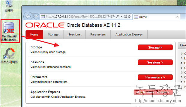 ▼ 다음은 계정을 추가하기 위해 관리자 페이지로 접속합니다. XE 설치할 때 바탕 화면에 추가된 Get Started With... 아이콘을 클릭하거나 웹브라우저에 http://127.0.0.1:8080/ 을 입력하시면 접속이 가능합니다.