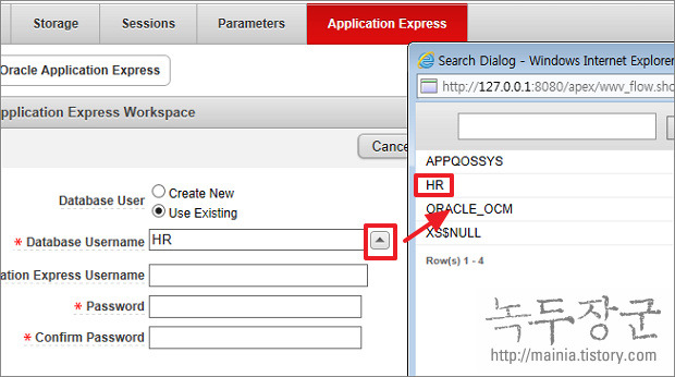 ▼ Database Username 은 당연히 HR 이겠죠. 입력 창 옆에 있는 화살표 버튼을 클릭하시면 리스트에 HR 을 볼 수 있습니다