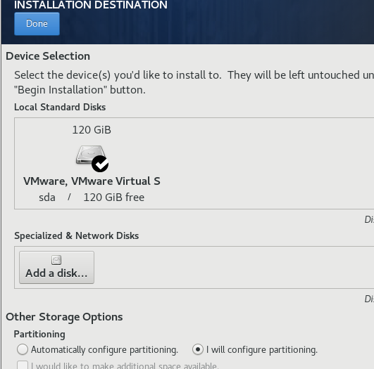 - Storage 는 직접 파티셔닝 할 것 이므로, 다음 설정을 누르고, DONE 을 눌러주자