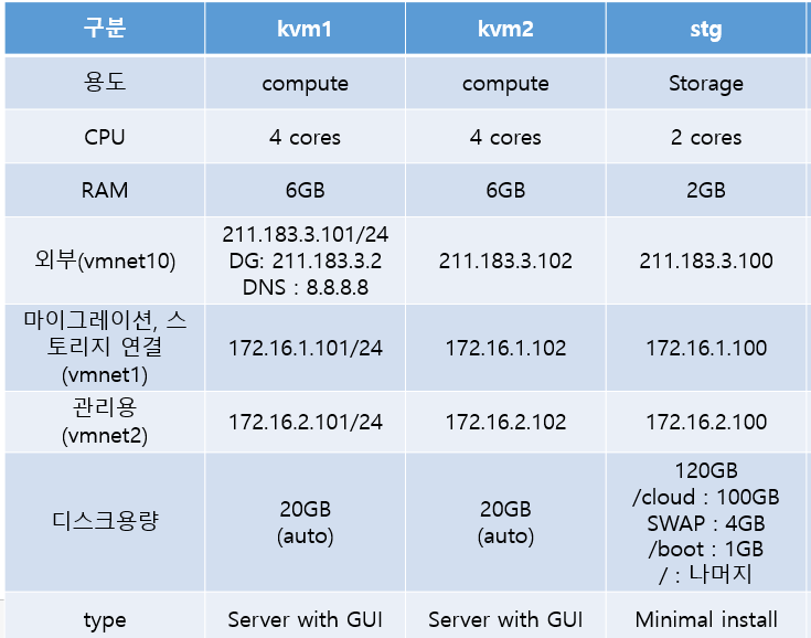 - KVM1 , KVM2 는 Server with GUI 이므로, 이를 설정해주자. Storage 는 Minimal 이므로 따로 설정하지 않아도 된다