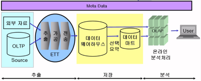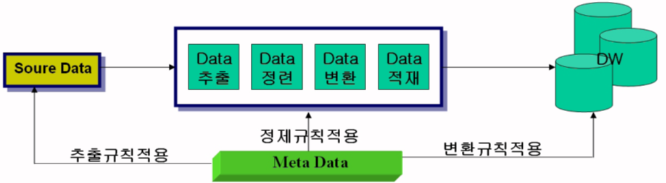 | 메타데이터 | 데이터의 사용성과 관리효율성 향상을 위한 데이터에 관한 데이터 DW 아키텍쳐 구성 요소간의 결합력(Cohesiveness)을 유지시켜주는 매개체 |