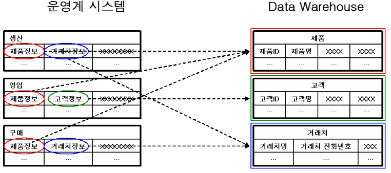 - 운영계 시스템의 생산, 영업, 구매 테이블에 제품, 거래처, 고객 등의 중복되는 데이터를 Data Warehouse 는 하나의 주제 영역으로 분리하여 데이터를 관리함