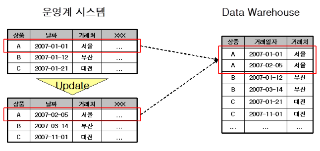 - 운영계 시스템 데이터는 Update 가 일어나면 기존 데이터는 지워지지만, Data Warehouse에서는 각 시점에 있던 데이터를 모두 저장함