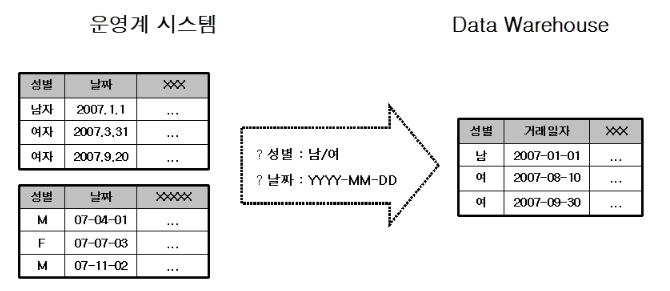 - 운영계 시스템의 데이터 성별이 남자/여자 또는 M/F등 정보마다 각기 다르고, 날짜 형식 또한 다양하여 통일된 형식으로 변환시켜 Data Warehouse에 적재시킴