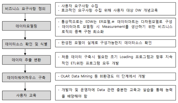 - 데이터 웨어하우징(Data Warehousing)은 데이터의 수집 및 처리에서 도출되는 정보의 활용에 이르는 일련의 프로세스